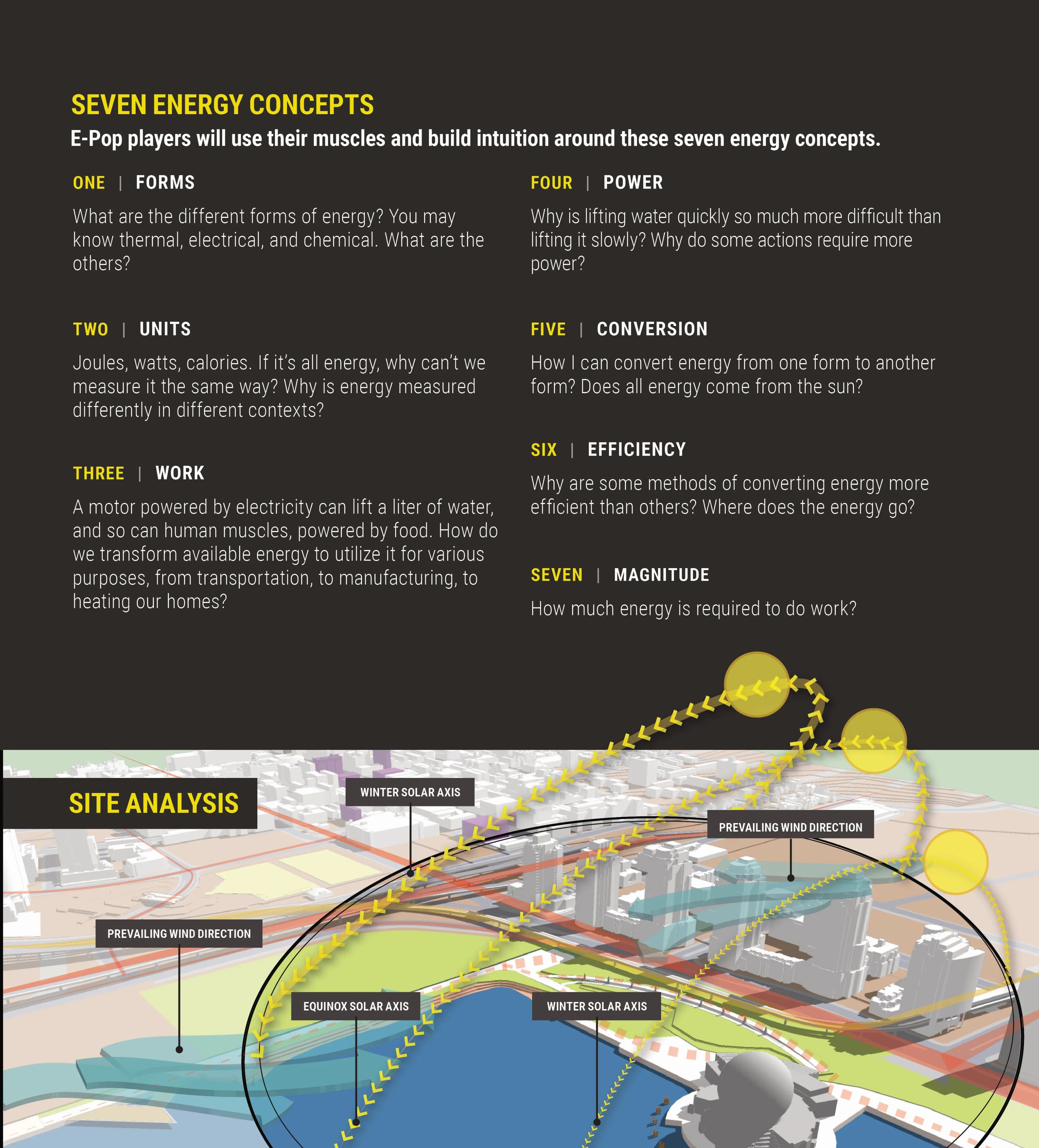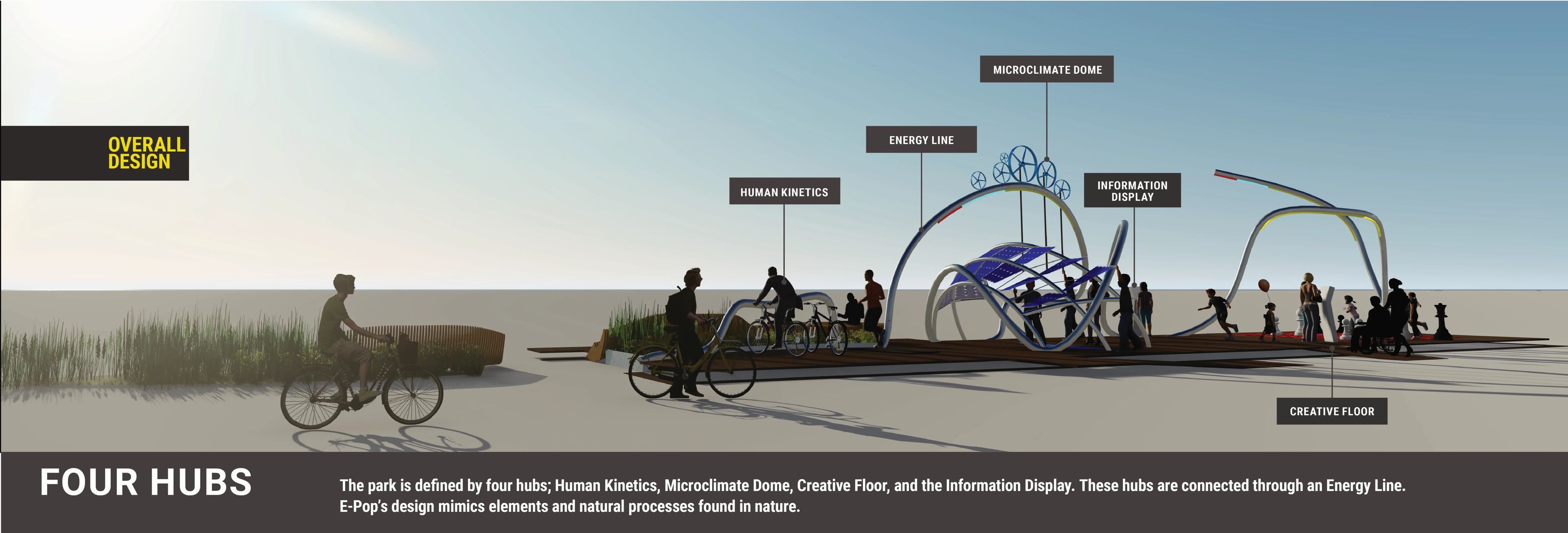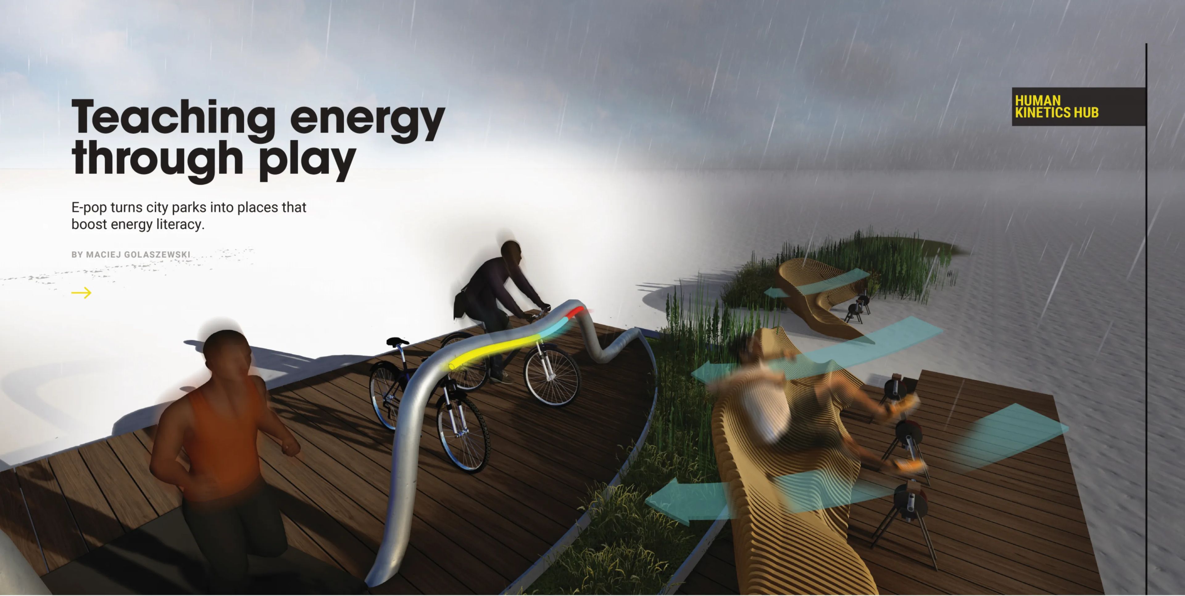E-Pop Park is an interactive public space concept that turns recreation into a real-world lesson on renewable energy. Visitors can generate power by moving—dancing, cycling, or using kinetic benches—and track their energy production on digital displays or a mobile app in real time. The project addresses the gap in energy literacy by transforming everyday park activities into engaging demonstrations of energy transfer, conservation, and use. Through play, people learn how much effort it takes to produce electricity and how individual choices impact sustainability. Located in Vancouver, British Columbia, E-Pop Park demonstrates how public design can connect environmental awareness with fun, active experiences—helping cities boost energy education and inspire more responsible urban living.
