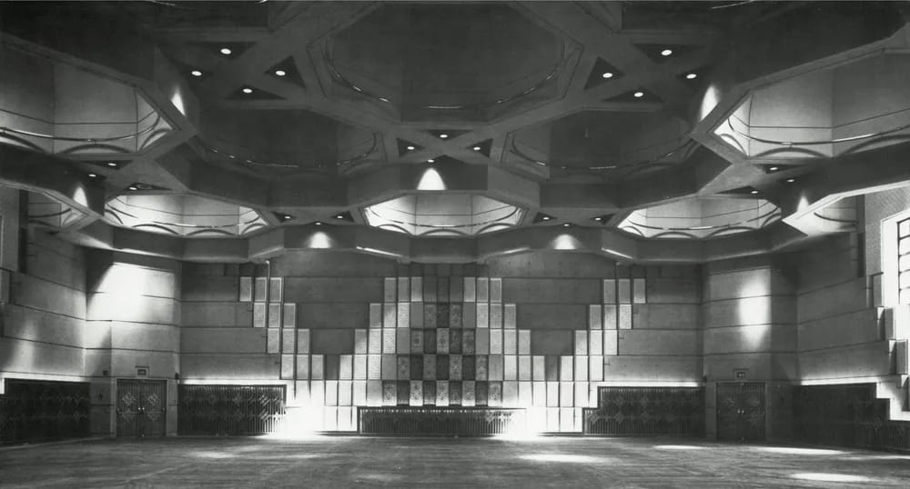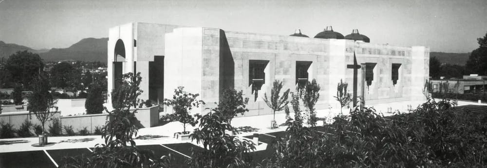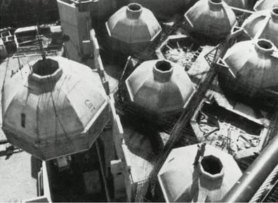 This is the first Ismaili Mosque in North America. The building is a reinforced concrete structure, predominantly cast in situ. The floors and roofs are diagonal grids of beams spanning up to 150 feet (46 metres), covering rectangular and square areas. The prayer hall roof is a grid of arch-like beams rising towards the center of the square room. Hemispherical precast concrete domes, 20 feet (6 metres) in diameter, are incorporated into an integral part of the roof structure.