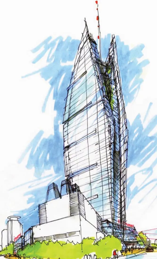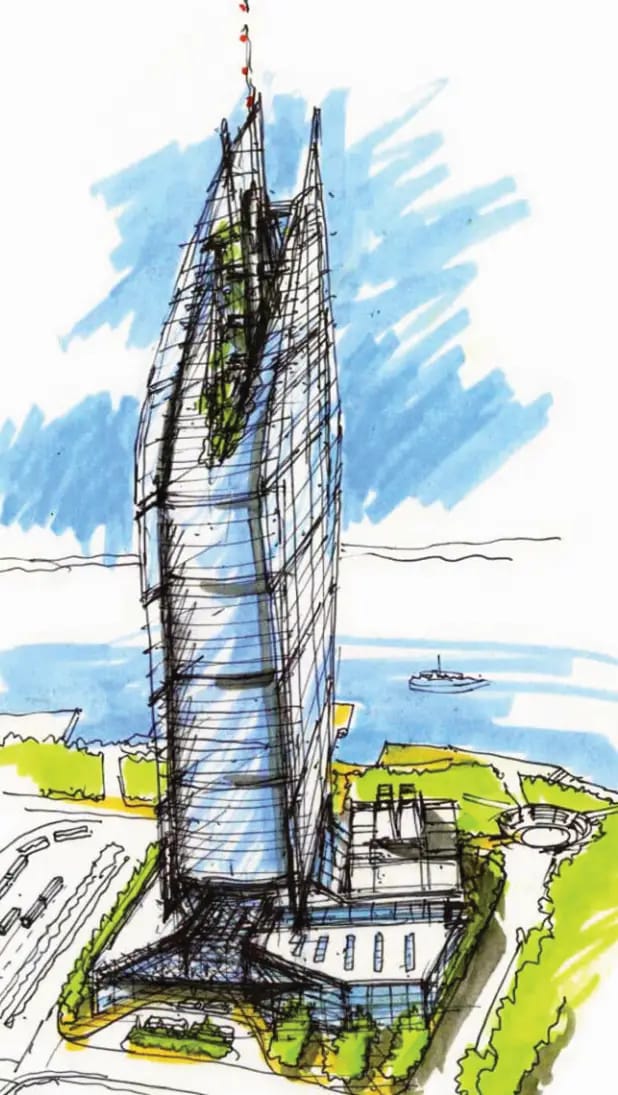 Located near the water and at the “prow” of the CBD the building design draws inspiration from the traditional Chinese Sampan sailboat but re-interprets this traditional element in a modern high-tech way.