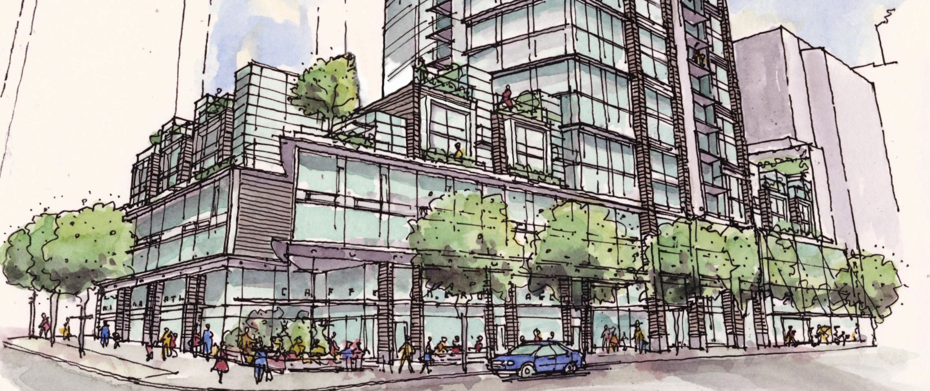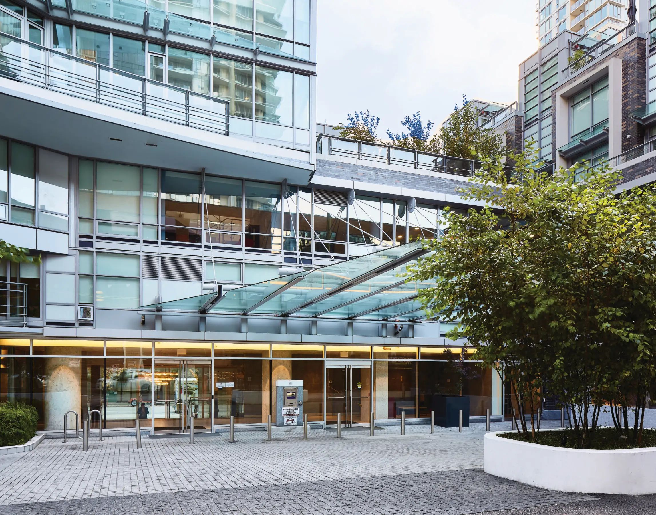 This mixed-use project consists of a 43-storey tower with LEED® Gold certification, housing 339 residential condominium suites and 20 rental suites. The project features 16 Artist Studios gathered around a central atrium north of the tower, dedicated as a public amenity. Double-height retail spaces animate the corner of Howe and Drake Streets, with townhouses and green roofs above. Passenger drop-off and access for all uses is from the lane, via a Porte Cochère. The porte cochere offers access to 5-storeys of underground parking beneath the site.