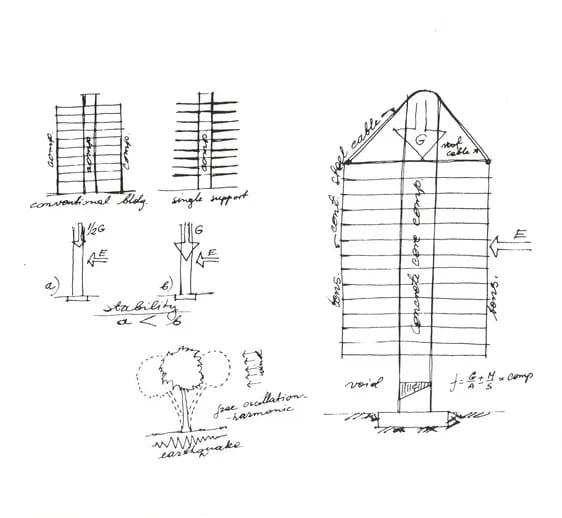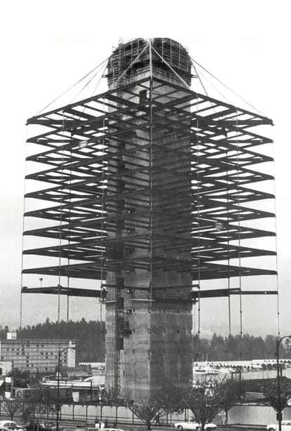 Award of Excellence Officially recognized as one of Canada's Historic Places, 1996 This office building comprises 152,000 square feet (14,000 square metres) of office space and features covered parking for 250 cars. Two major considerations during its design were minimizing obstruction of views caused by the building and addressing earthquake hazards. The vertical core enclosing the transportation media and various utilities is used to its full structural capacity, eliminating conventional columns. By hanging the floors from the top of the central core, the weight of the building acts as a prestressing force on the core, improving its stability and structural integrity during an earthquake.