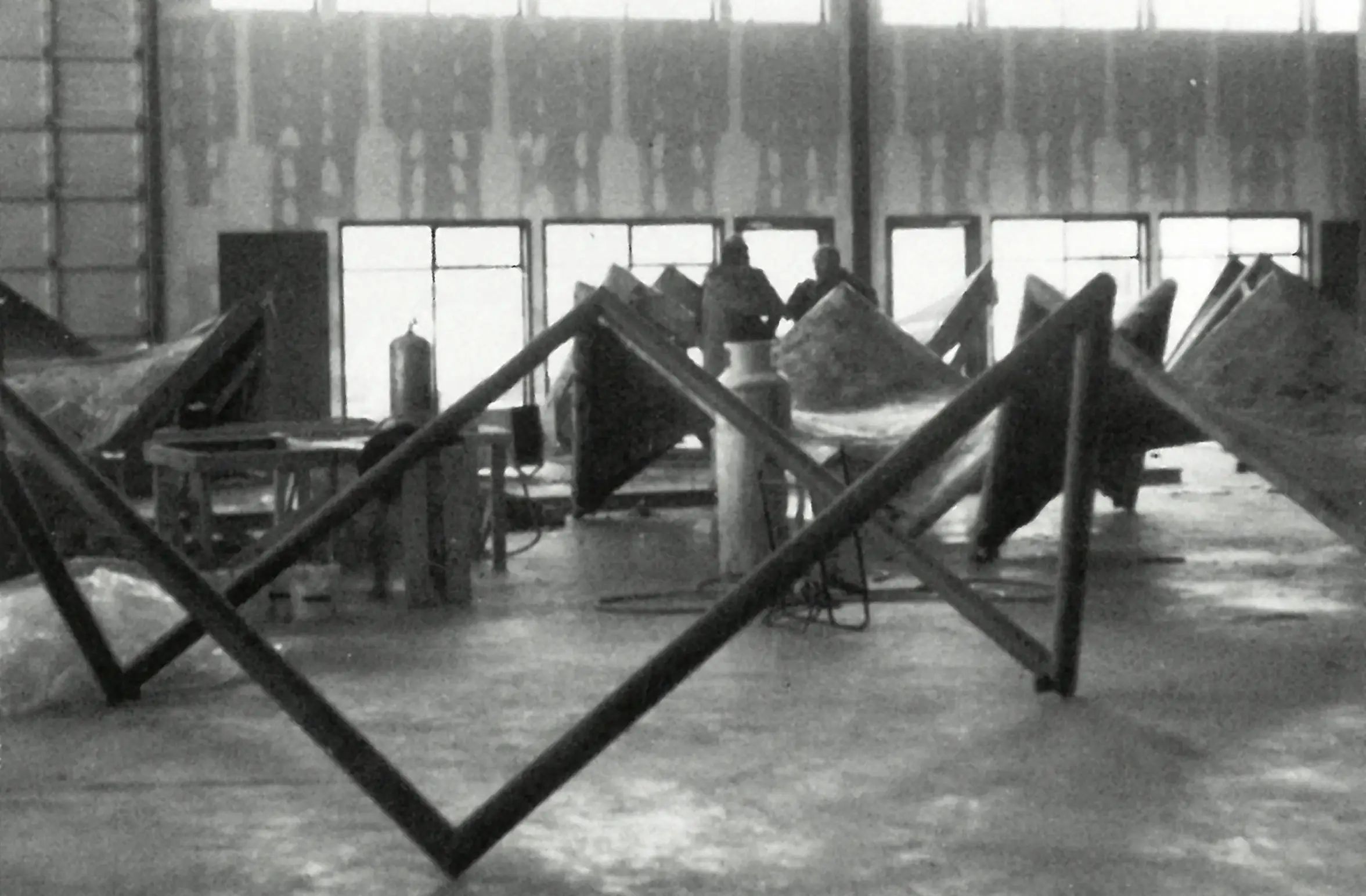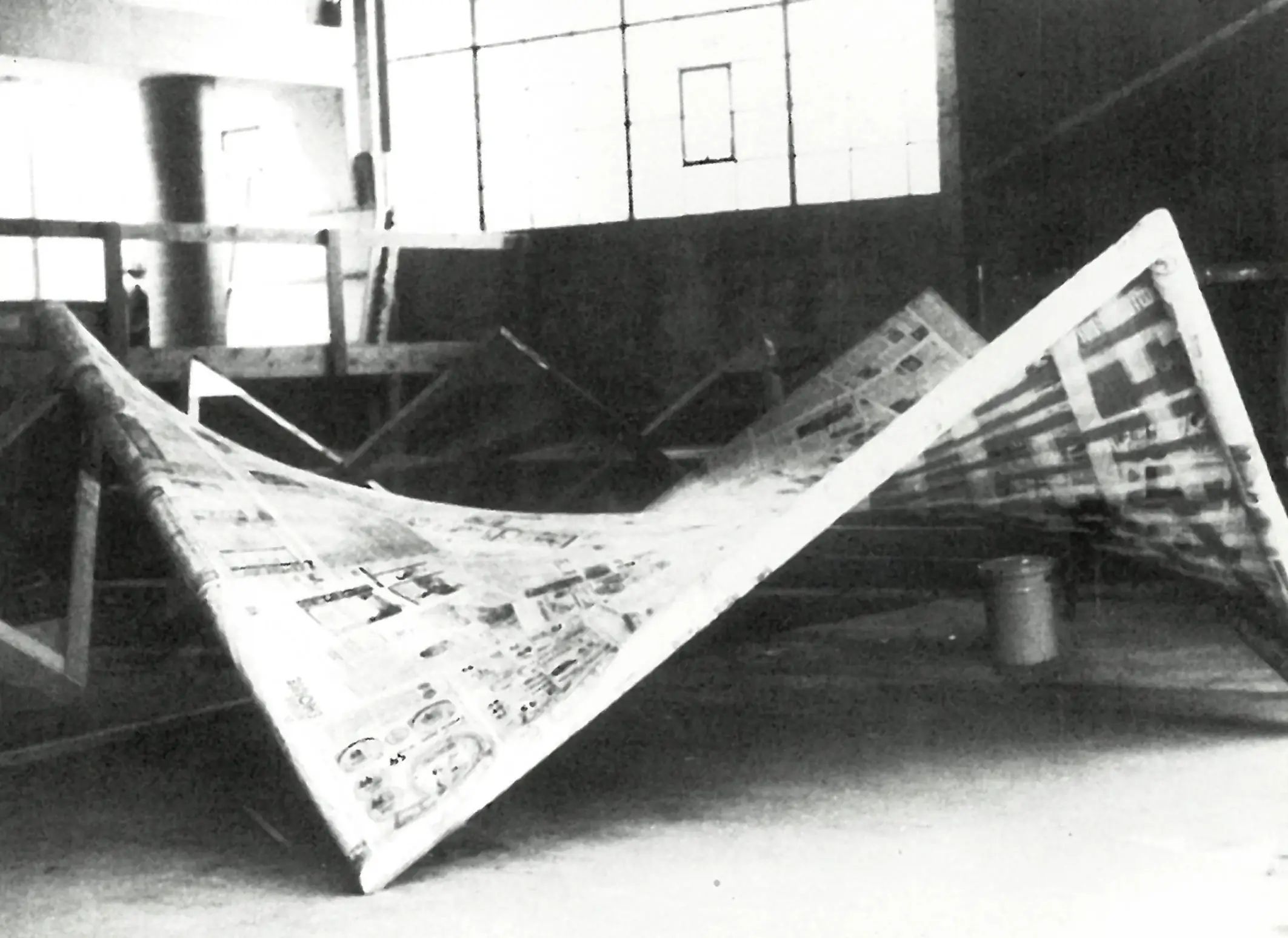 The design of the Conference Pavilion demonstrates the use of recycled materials and unskilled hands to construct buildings. The buildings consist of an assembly of prefabricated shells made of paper tubes and recycled newspaper supported by wooden columns. The shell elements were fabricated by placing the perimeter paper tube frames on wooden molds. The membrane was then built by laminating layers of newspaper with glue. Later, the units were painted and decorated by the schoolchildren who had built them. The shell units, 8.5 feet square (2.6 metres square) in plan, were assembled on the site to form multiple space grids spanning up to 34 feet (10 metres).
