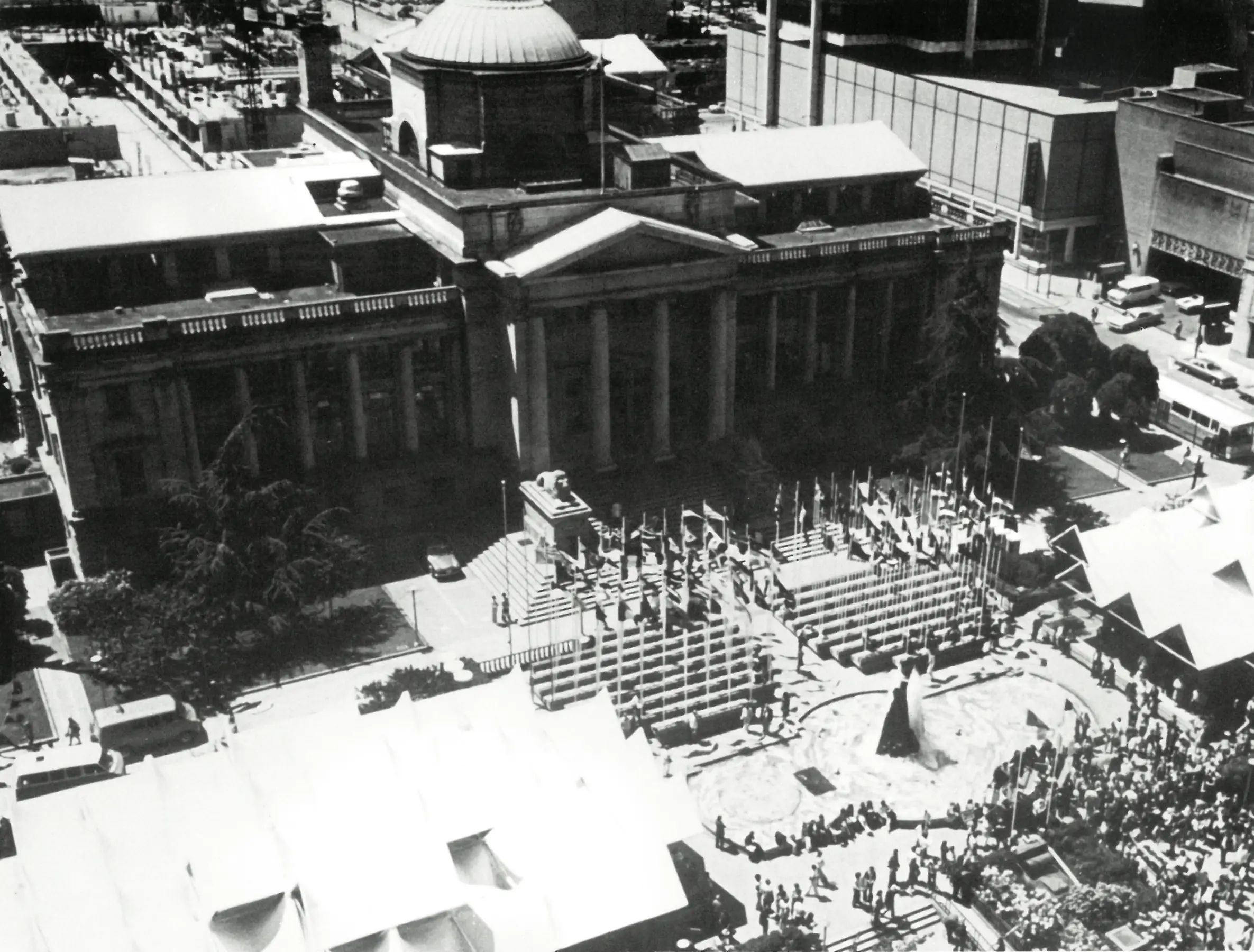 A heritage courthouse building was extensively remodeled to meet the special requirements of a modem art gallery while retaining the original exterior shell of the building. A new reinforced concrete skeleton was inserted into the old shell in order to accommodate the gallery’s spatial requirements and to meet current safety and seismic requirements.